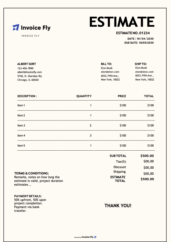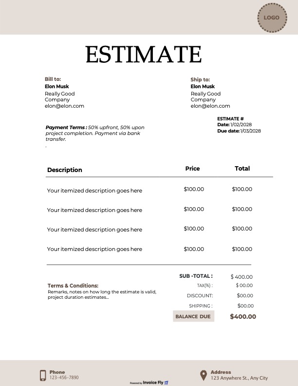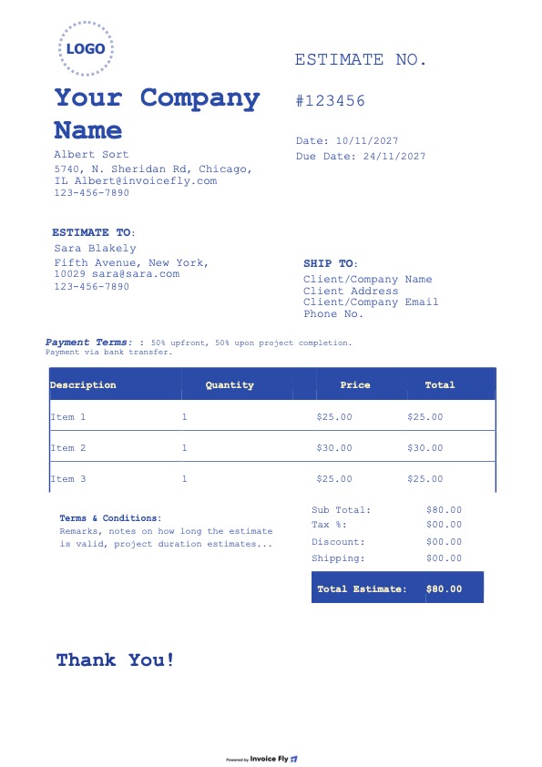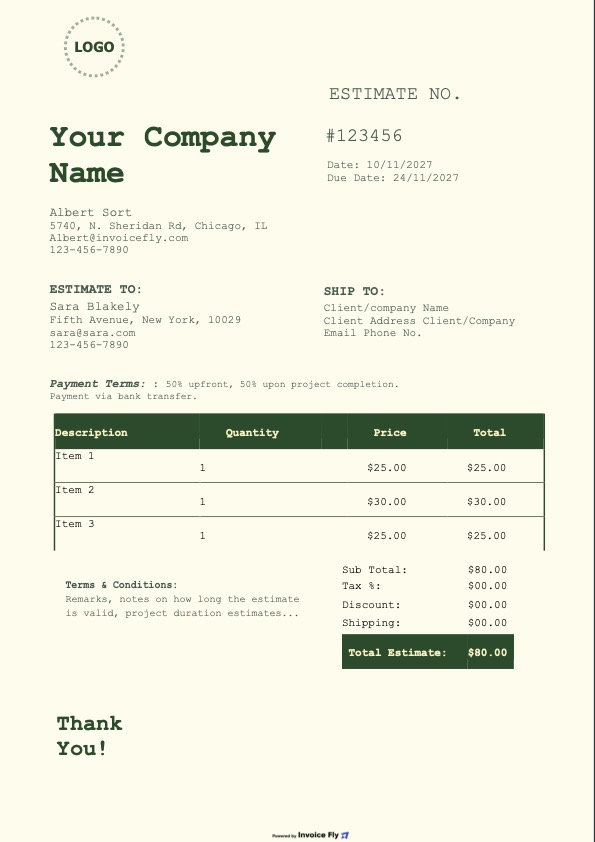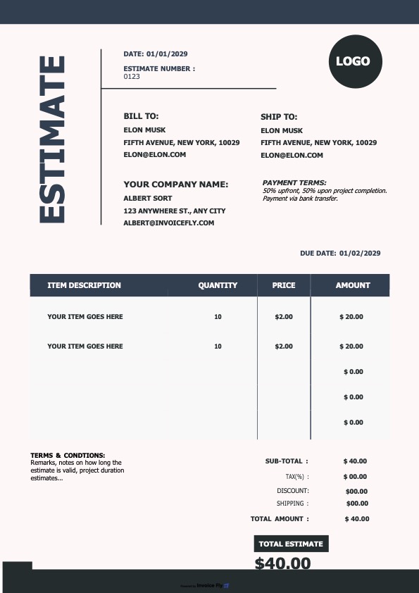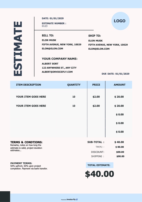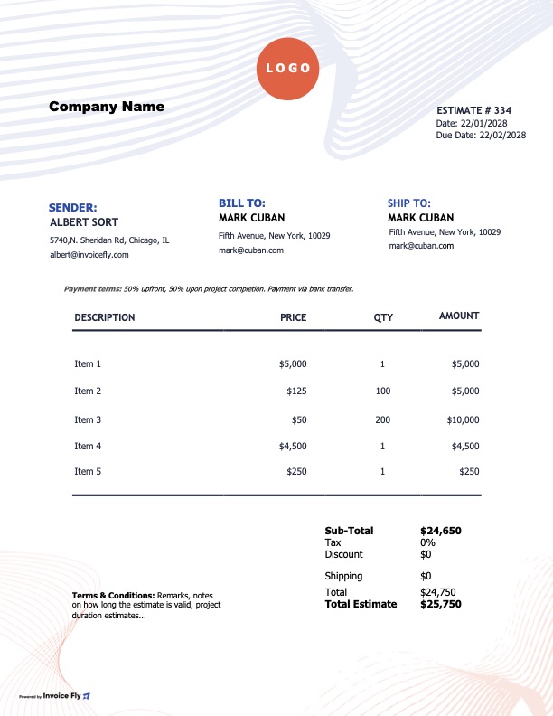 - Create professional estimates with your logo, brand colors, and business details