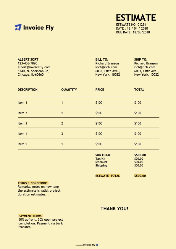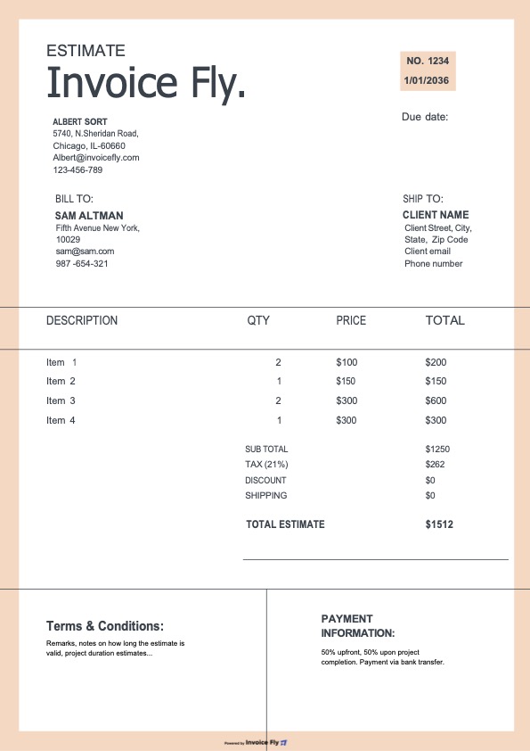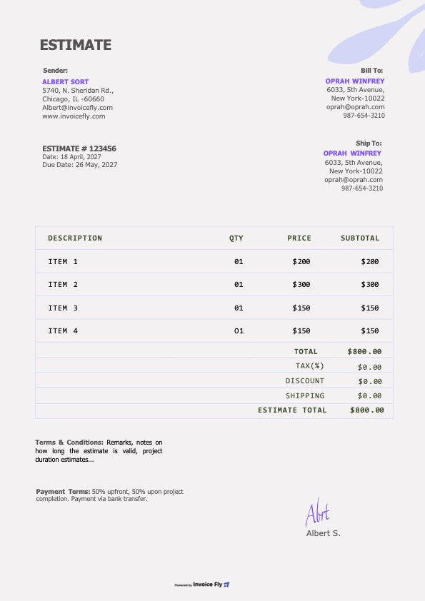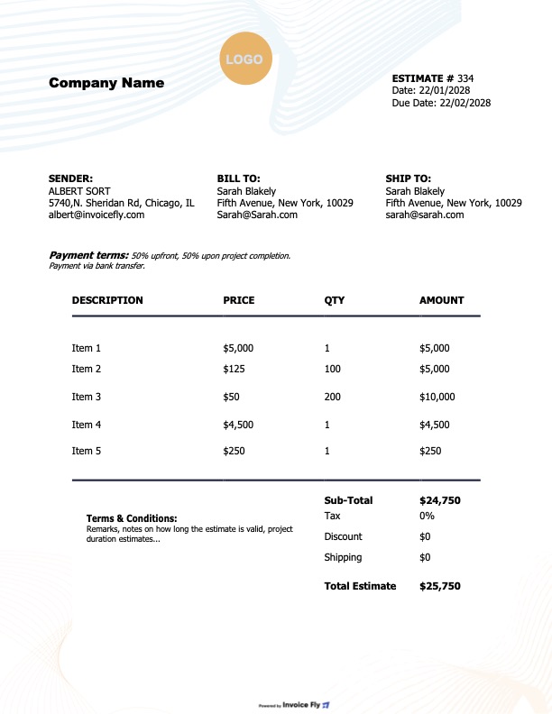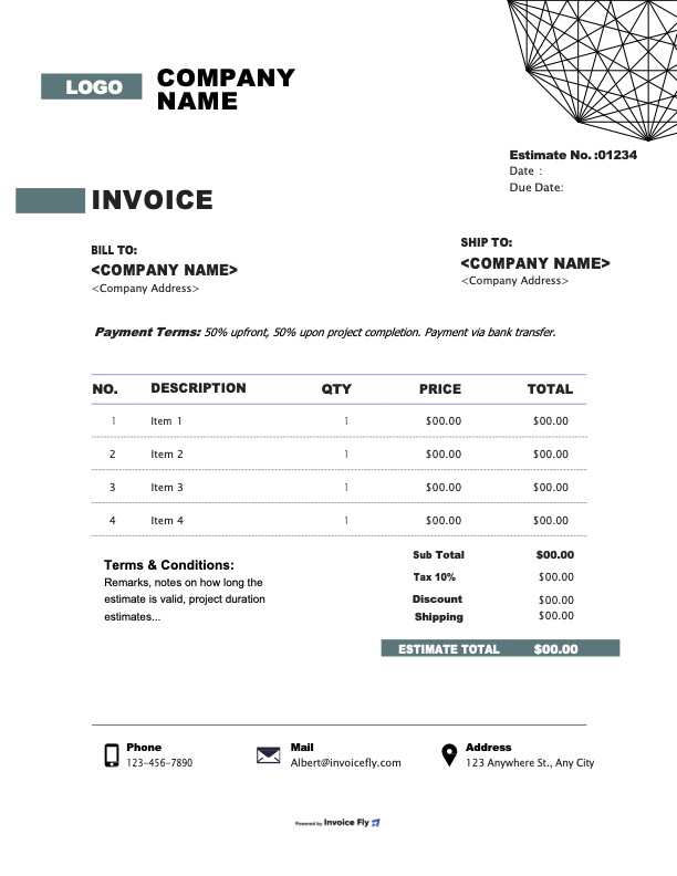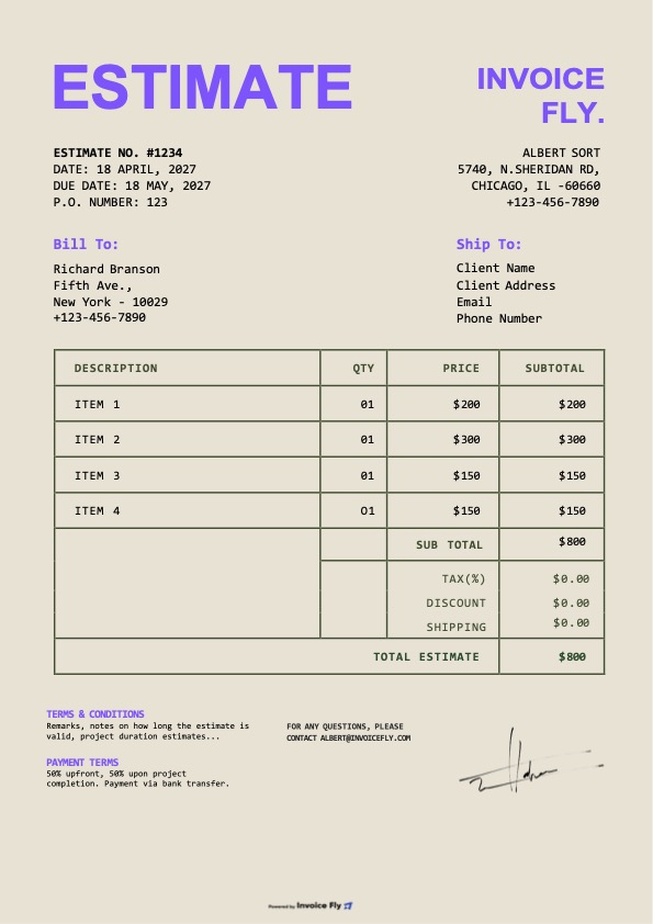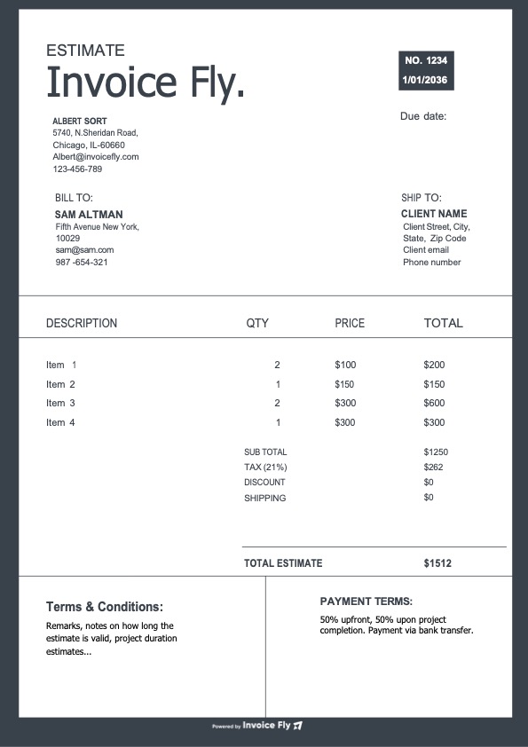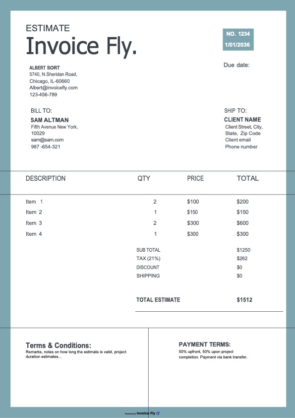 - Optional fields such as PO number, project name, and terms & conditions