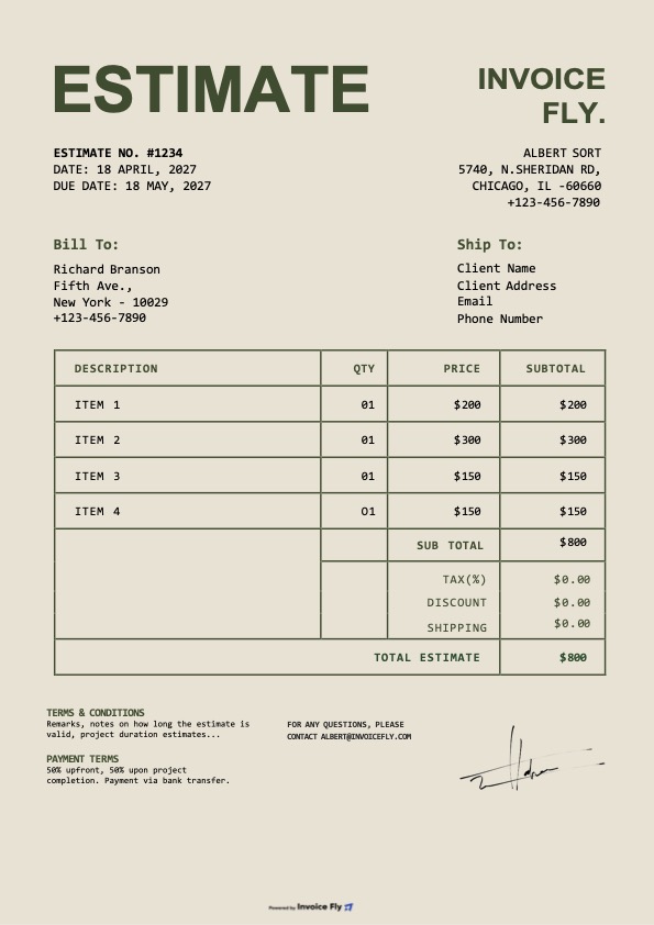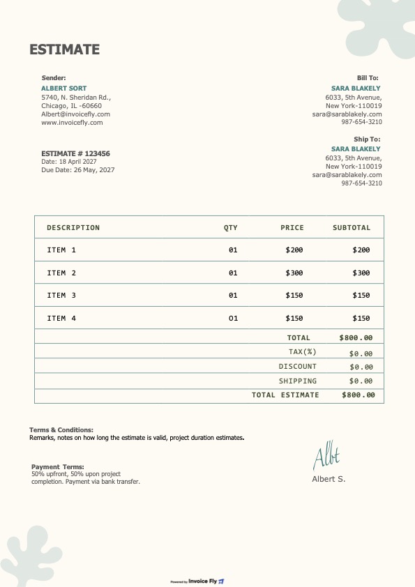 - Review the final estimate, add your terms, expiration date, and a short note