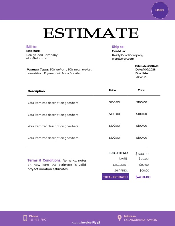 An Excel estimate template is a spreadsheet designed to help you create professional estimates, quotes, and price proposals for clients. It includes editable fields for business details, client information, itemized products or services, pricing, taxes, and total estimated costs.
