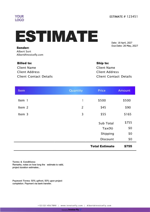 An Excel estimate template is a practical and professional way to create client estimates, project quotes, and price proposals with built-in calculations. If you need a flexible and efficient solution, Excel helps you prepare accurate estimates, organize pricing details, and manage your documents more easily without starting from scratch. Our editable estimate templates include everything you need—logo, business details, client information, itemized services or products, taxes, totals, and terms—so you can create polished estimates faster.